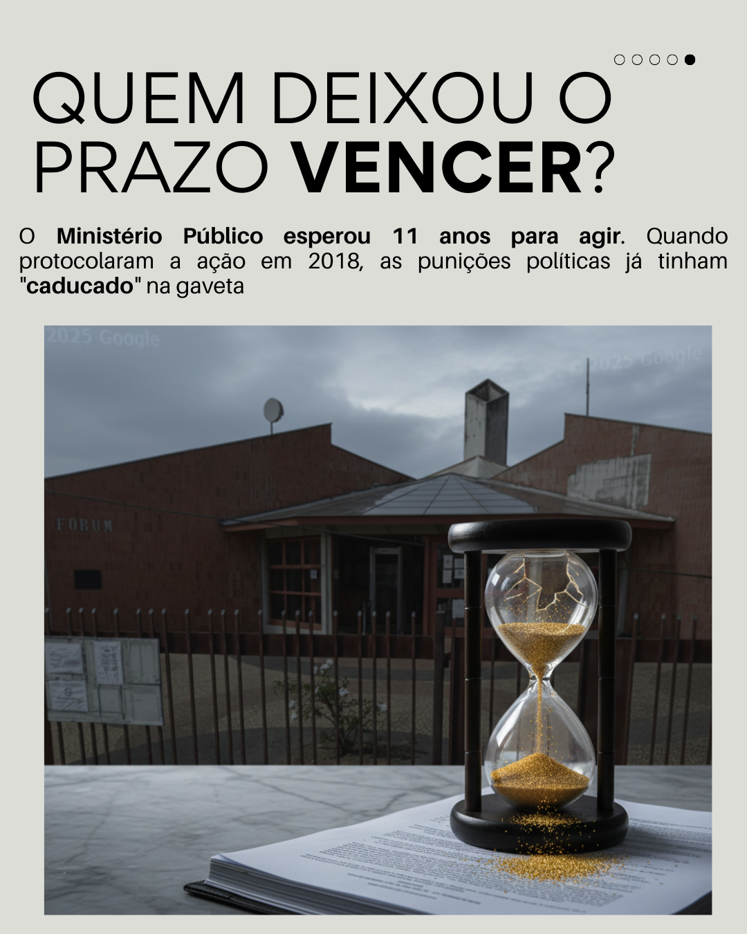 O Ministério Público (MP) e a Procuradoria do Município assistiram ao tempo passar. Ao protocolarem a ação apenas em 2018 (11 anos depois!), eles entraram em campo com o jogo já perdido na parte política.