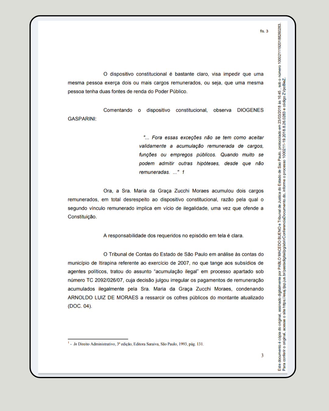 A origem do escândalo remete aos anos de 2005 a 2007. Maria da Graça Zucchi Moraes exercia, simultaneamente, dois cargos de alto escalão: Supervisora de Ensino (Estado) e Secretária de Educação (Município). A Constituição é cristalina (Art. 37, XVI): a acumulação é ilegal.